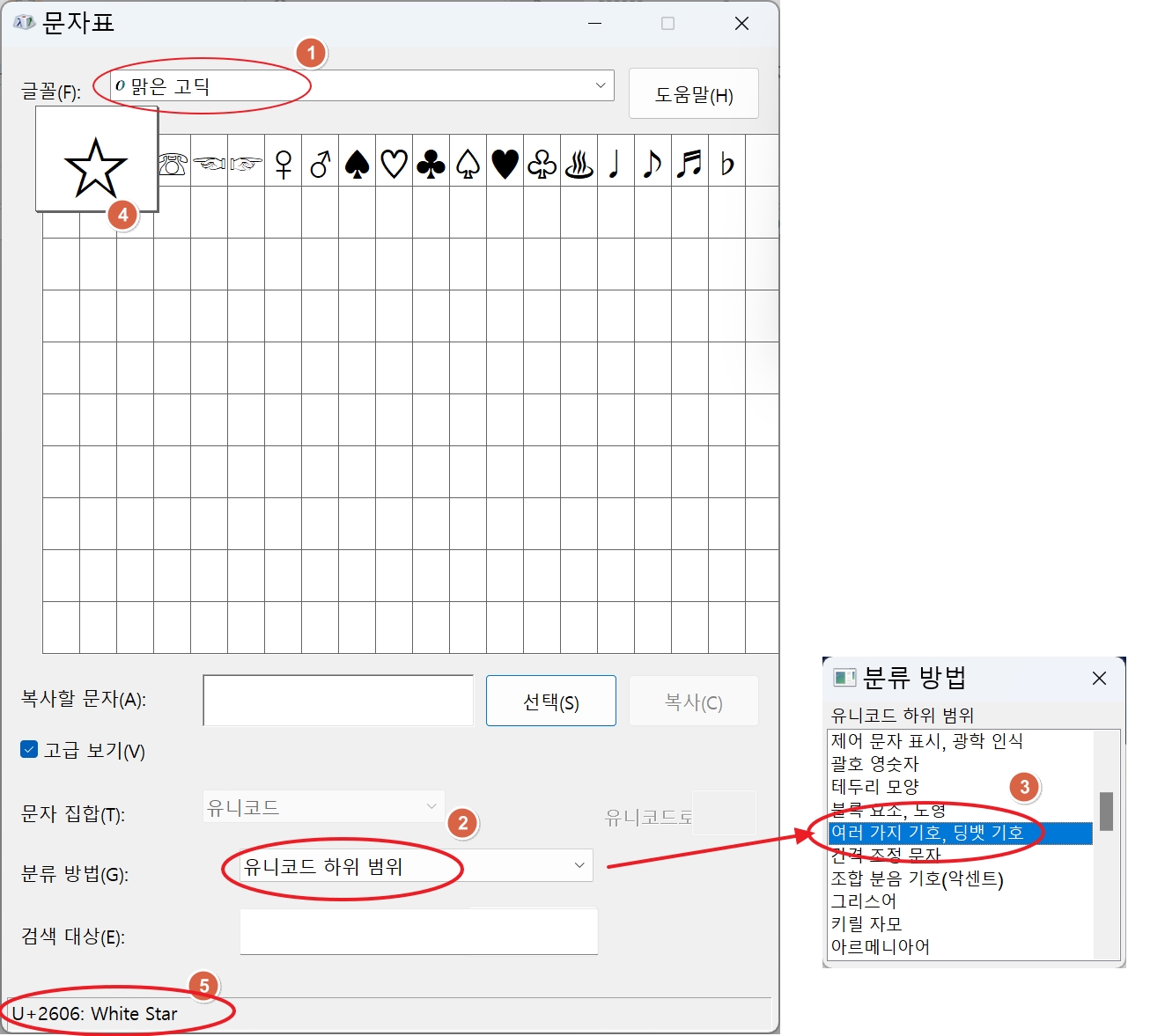 2) 유니코드 하위 범위로 '여러가지 기호, 딩뱃 기호' 영역 선택,