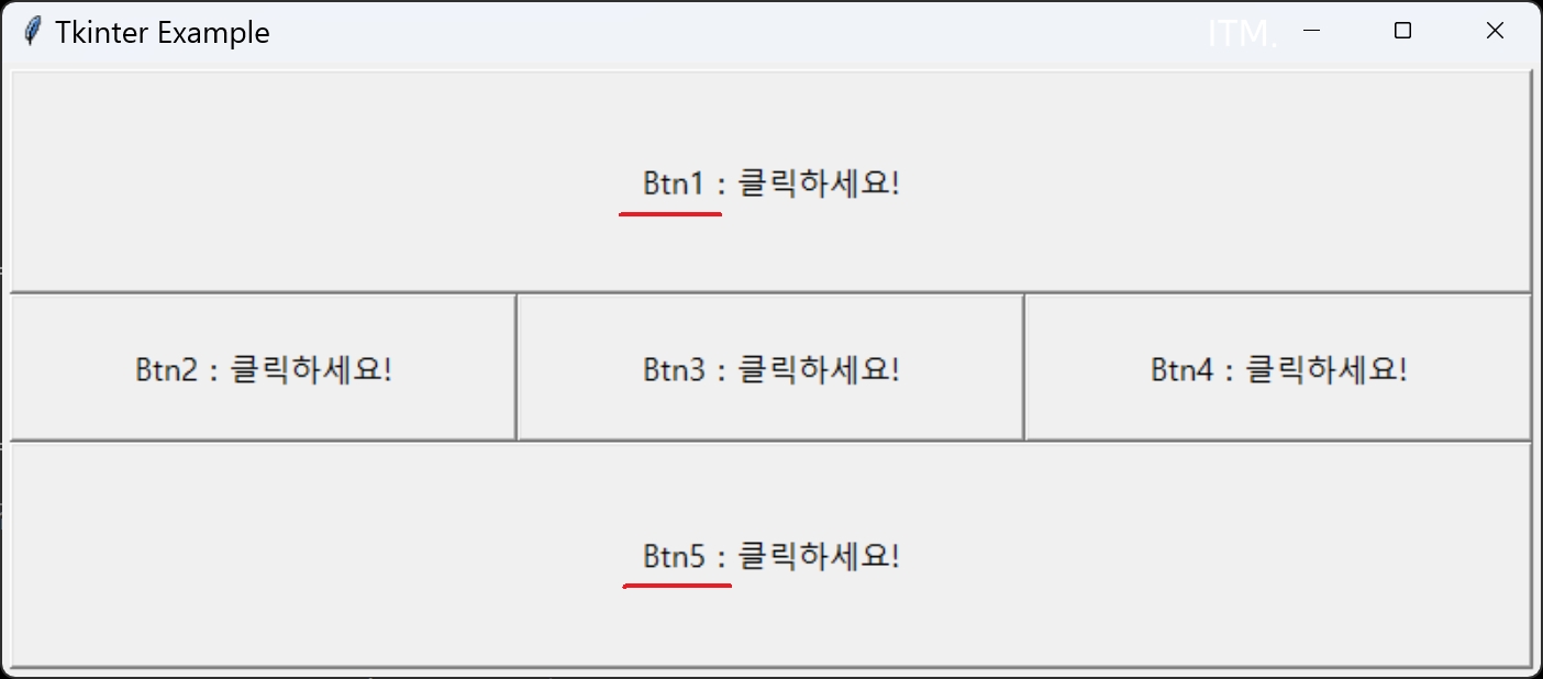 button5 = tk.Button(root, text="Btn5 : 클릭하세요!")