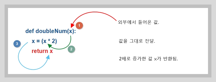 3) doubleNum(x) 함수는 x값을 전달받아 이 값을 2배로 만들고 다시 x에 저장합니다. (x * 2) 부분에 괄호는 필요없으나 과정을 보다 더 명확하게 보여줍니다. 있어도 괜찮습니다.
