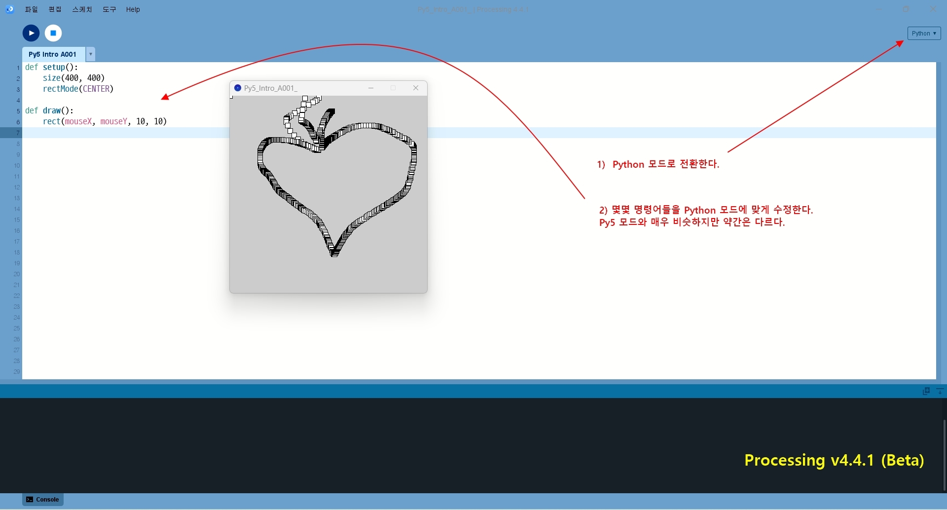 파이썬 모드가 추가되면 기존 방대한 프로세싱 명령어에 더하여 파이썬 명령어까지 함께 사용할 수 있어서(에에?? 진짜일까요??) 하나의 소스 코드에 2개의 프로그래밍 언어를 사용할 수 있게 되는 느낌이 듭니다.