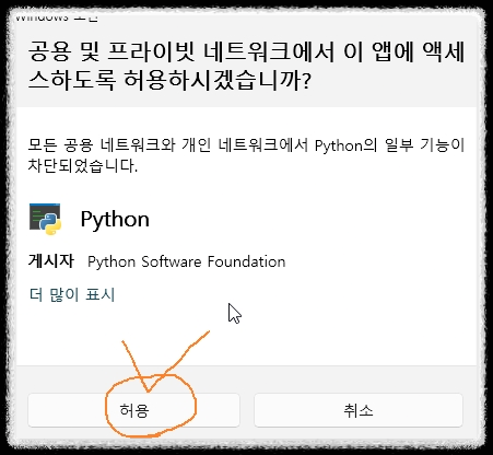 설치 혹은 그 이후 코드 실행에서 보안 경고 창이 나타날 수 있습니다. 허용을 선택하세요.