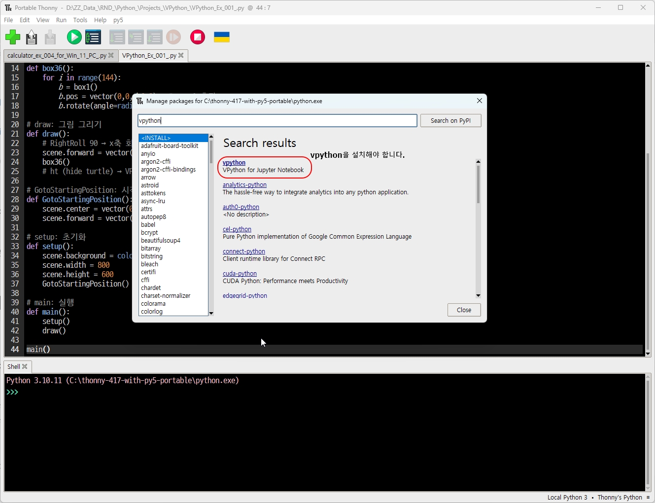 3) Thonny에서 설치하려면, Thonny Menu / Tools / Manage packages ... 로 들어가서 검색창에서 검색합니다. 검색 키워드는 vpython. 인터넷 연결을 통해서 vpython이 설치되므로 이때 인터넷 연결이 필요합니다.