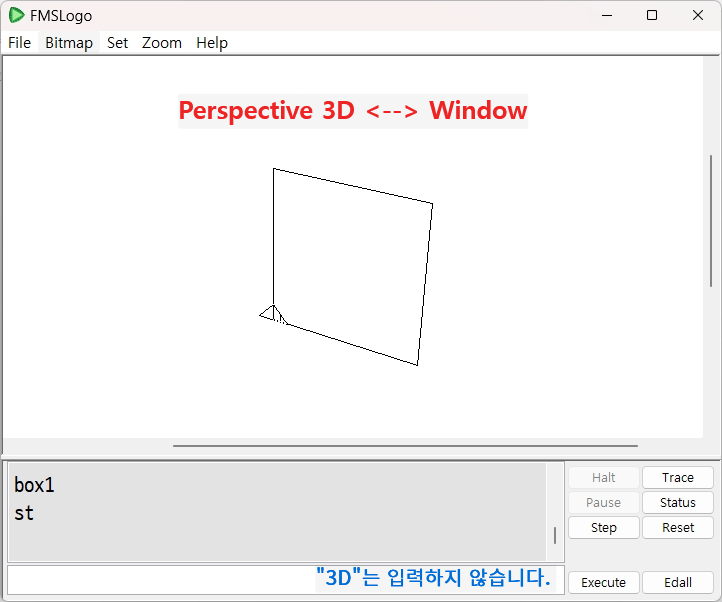 이하 응용 연습 예제들은 중급 이상 예제입니다. 무리하시지는 마세요. 이 예제는 위 본문의 FMS Logo 코드를 어쨌든 파이썬으로 비슷하게 변환합니다. 파이썬 내장 turtle 모듈은 2D 전용이라서 3D로 뭔가를 그리려면 다른 보완 대안이 필요합니다. 아래에서는 죽이되든 밥이 되든 무조건 파이썬으로 변환. vpython이 약간의 도움이 됩니다. ^.^;