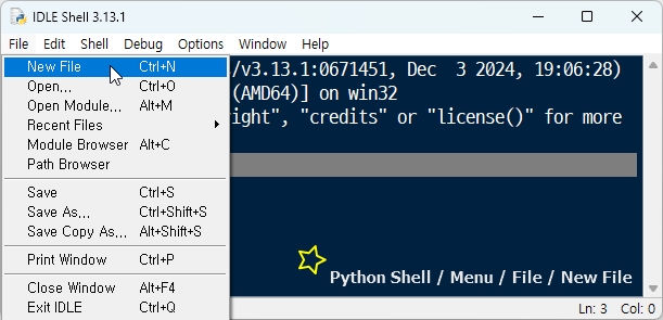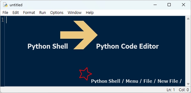 쉘에서 상단에 있는 메뉴 --> 파일File --> 새 파일New File.. 로 들어가면 편집기 창으로 들어갈 수 있습니다.