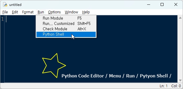 그 반대로, 편집기에서 쉘로 들어가려면 편집기 메뉴 --> Run --> Python Shell 로 들어가면 됩니다.